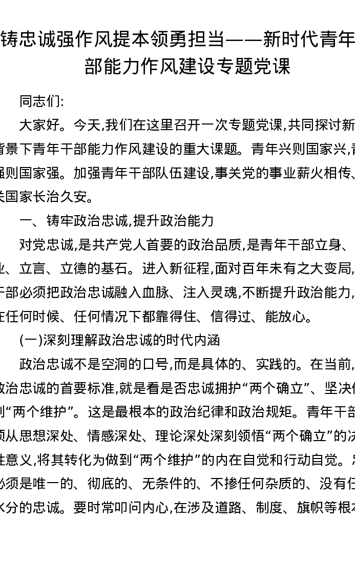 铸忠诚强作风提本领勇担当——新时代青年干部能力作风建设专题党课