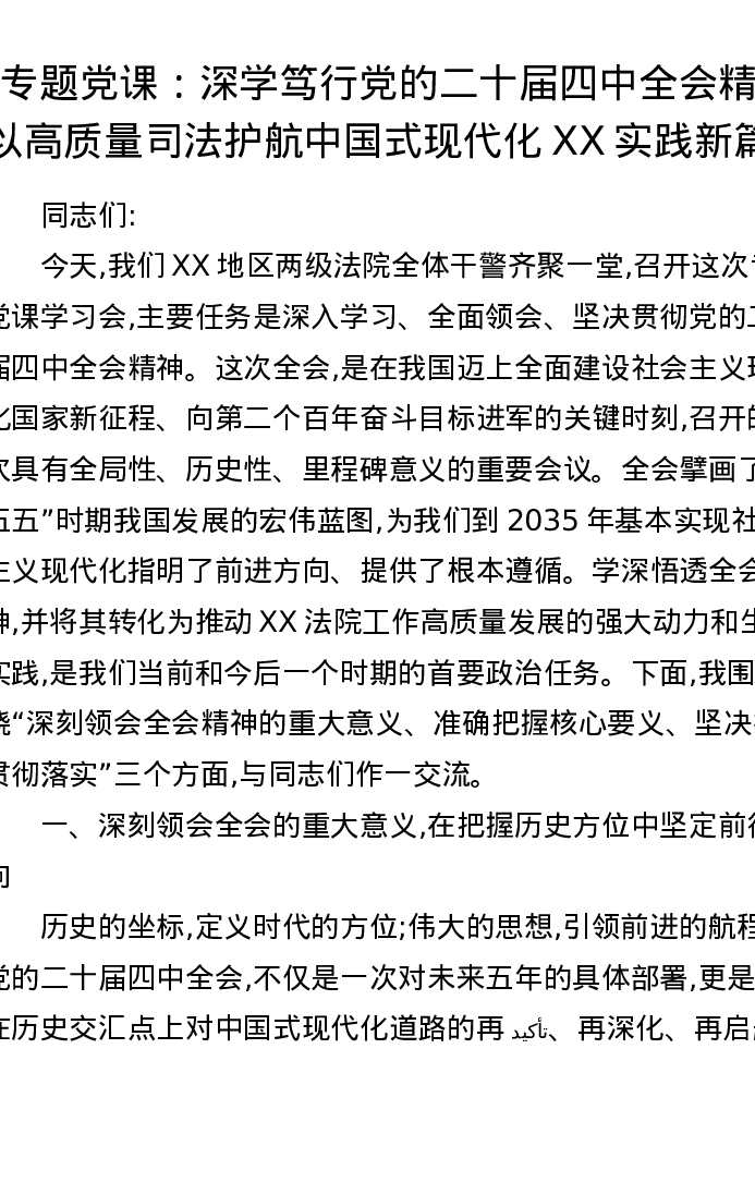 专题党课:深学笃行党的二十届四中全会精神以高质量司法护航中国式现代化XX实践新篇章
