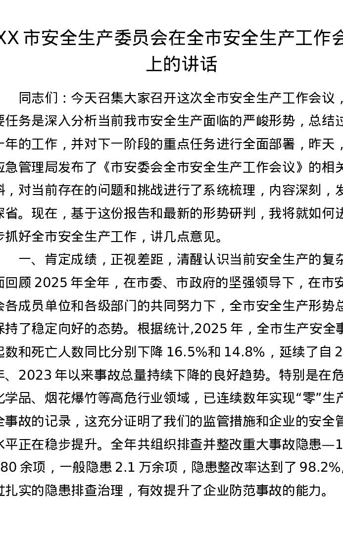 XX 市安全生产委员会在全市安全生产工作会议上的讲话