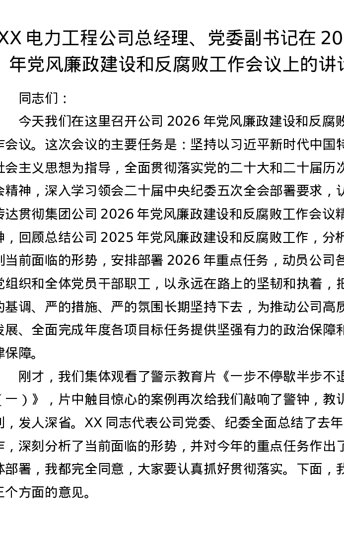 XX电力工程公司总经理、党委副书记在2026年党风廉政建设和反腐败工作会议上的讲话
