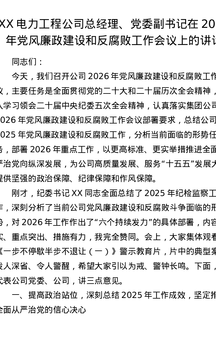 XX电力工程公司总经理、党委副书记在2026年党风廉政建设和反腐败工作会议上的讲话2