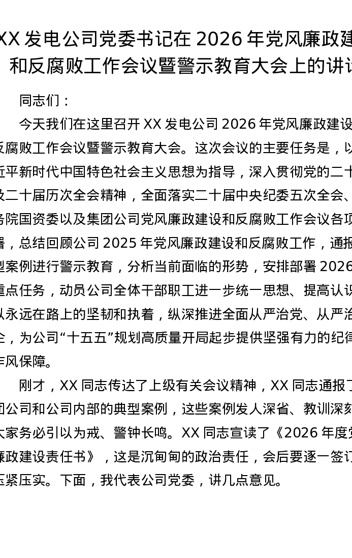 XX发电公司党委书记在2026年党风廉政建设和反腐败工作会议暨警示教育大会上的讲话3