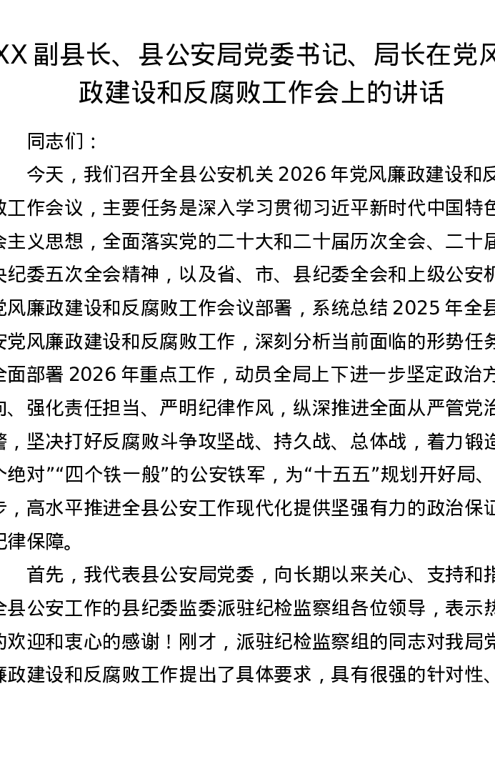 XX副县长、县公安局党委书记、局长在党风廉政建设和反腐败工作会上的讲话