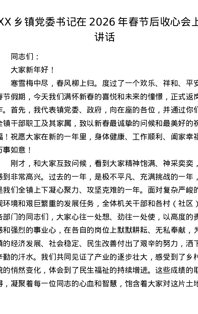 XX乡镇党委书记在2026年春节后收心会上的讲话