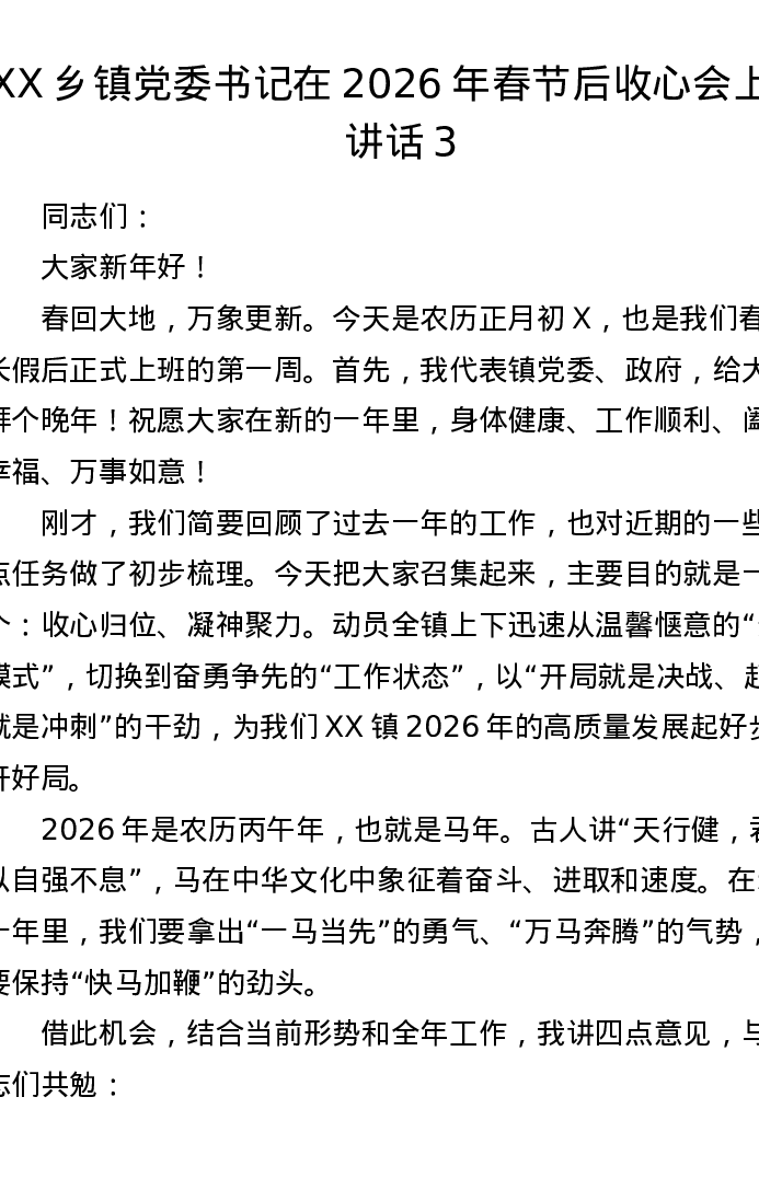 XX乡镇党委书记在2026年春节后收心会上的讲话3