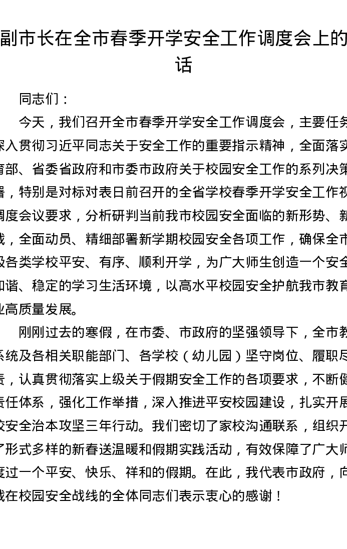 副市长在全市春季开学安全工作调度会上的讲话2