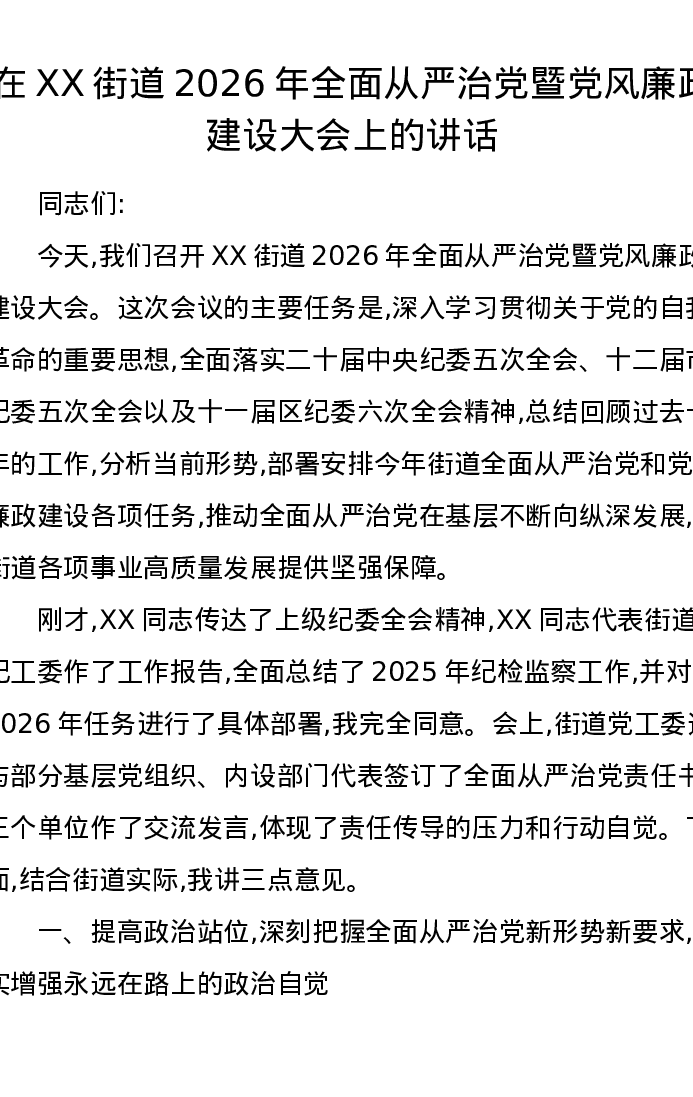 在XX街道2026年全面从严治党暨党风廉政建设大会上的讲话