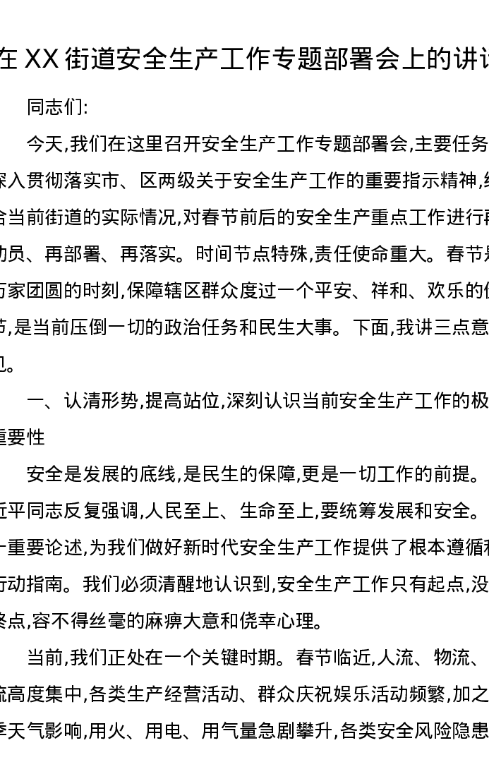 在XX街道安全生产工作专题部署会上的讲话