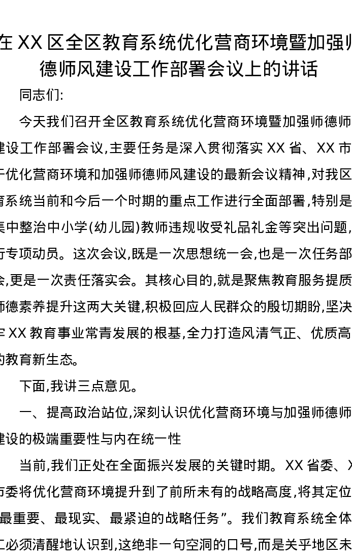 在XX区全区教育系统优化营商环境暨加强师德师风建设工作部署会议上的讲话