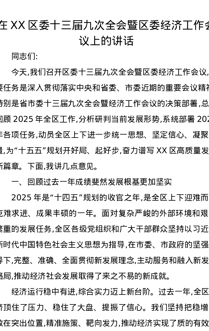 在XX区委十三届九次全会暨区委经济工作会议上的讲话