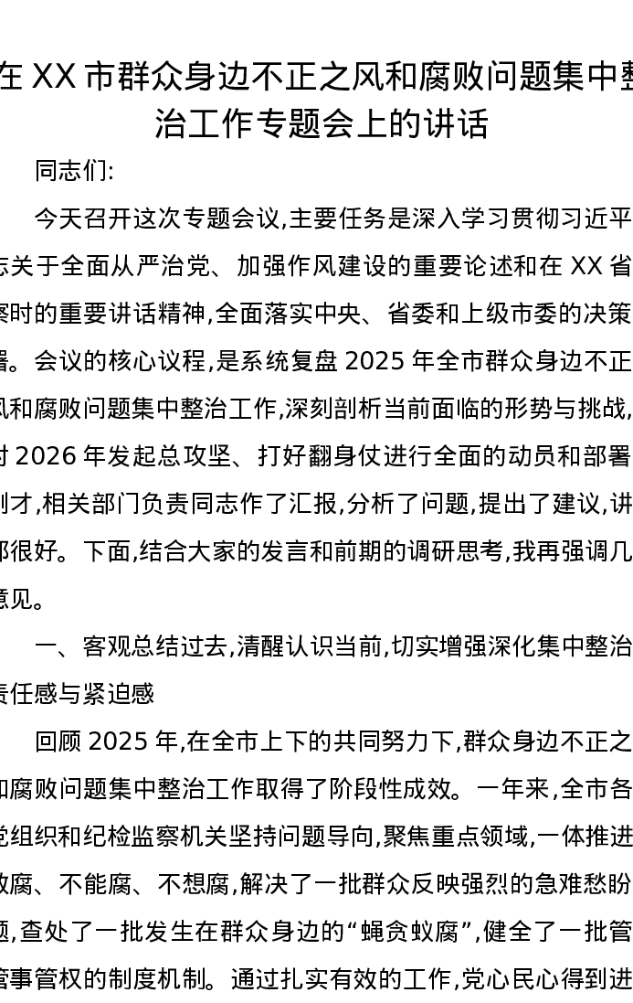 在XX市群众身边不正之风和腐败问题集中整治工作专题会上的讲话3