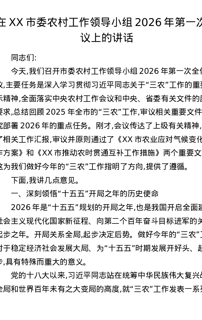 在XX市委农村工作领导小组2026年第一次会议上的讲话