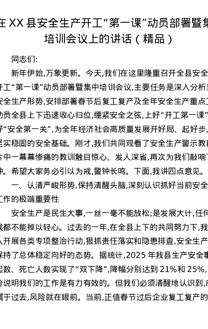 在XX县安全生产开工第一课动员部署暨集中培训会议上的讲话