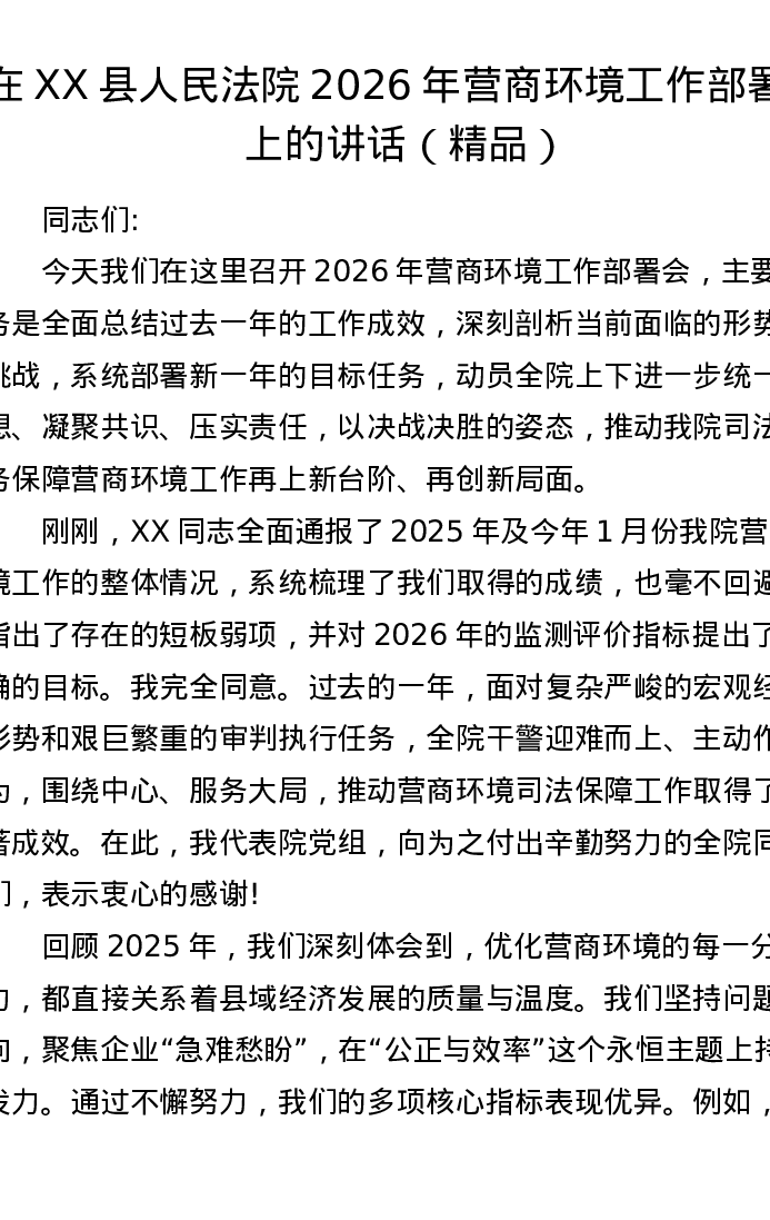 在XX县人民法院2026年营商环境工作部署会上的讲话