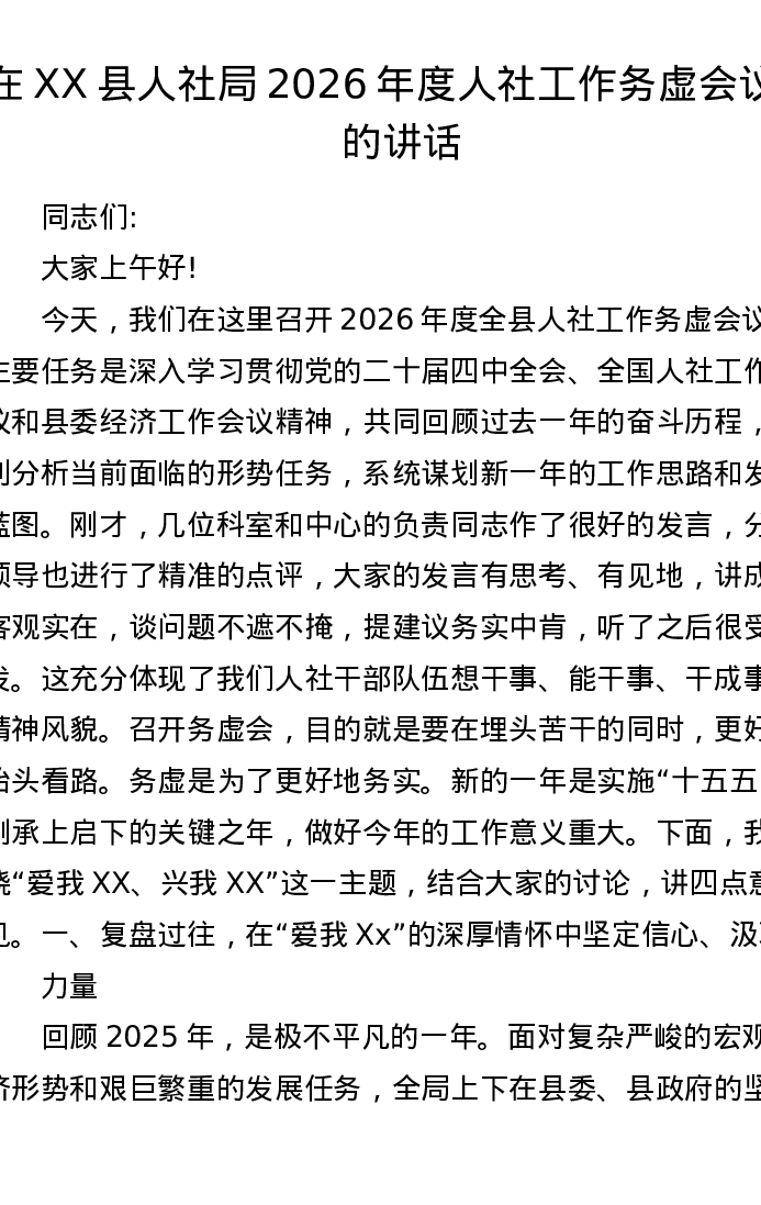 在XX县人社局2026年度人社工作务虚会议上的讲话