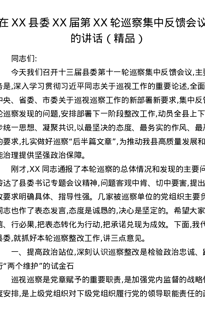 在XX县委XX届第XX轮巡察集中反馈会议上的讲话