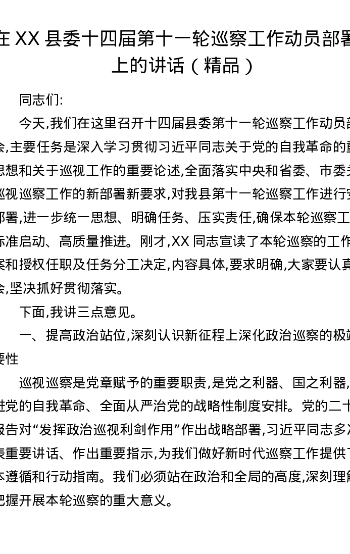 在XX县委十四届第十一轮巡察工作动员部署会上的讲话