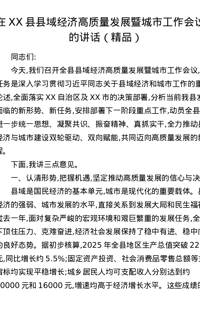 在XX县县域经济高质量发展暨城市工作会议上的讲话