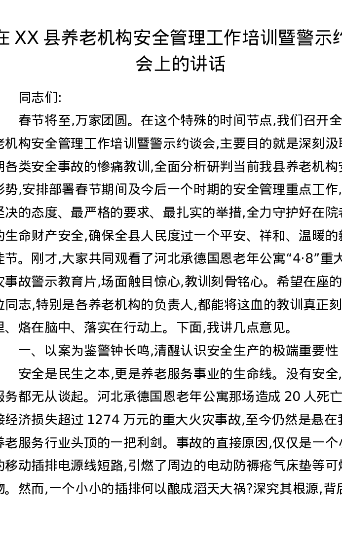 在XX县养老机构安全管理工作培训暨警示约谈会上的讲话
