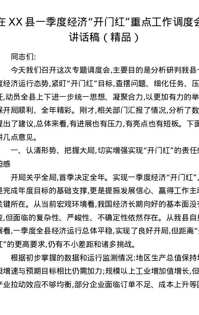 在XX县一季度经济开门红重点工作调度会的讲话稿