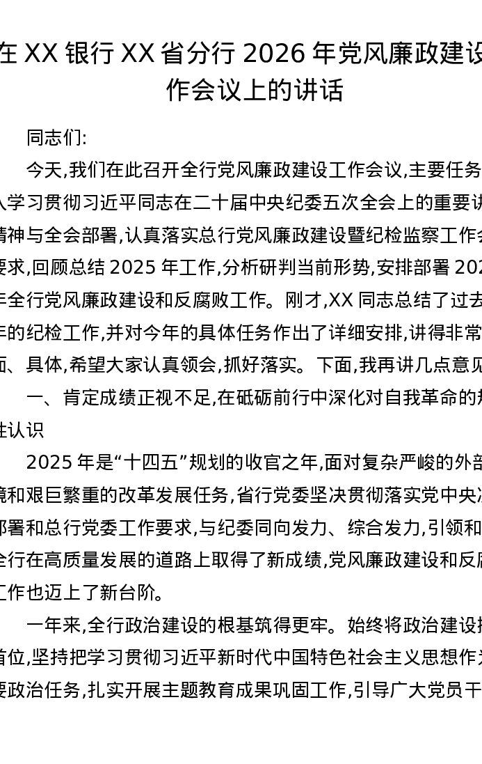 在XX银行XX省分行2026年党风廉政建设工作会议上的讲话