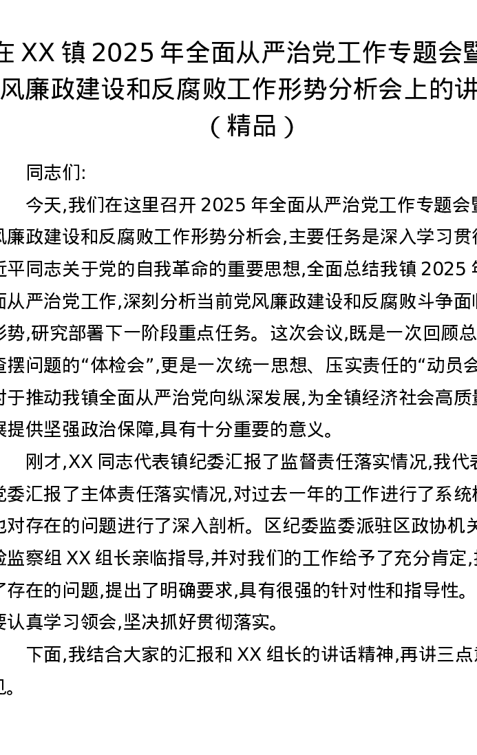 在XX镇2025年全面从严治党工作专题会暨党风廉政建设和反腐败工作形势分析会上的讲话
