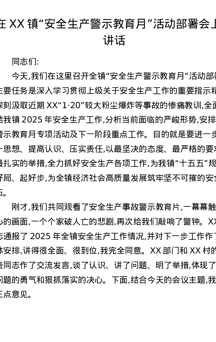 在XX镇安全生产警示教育月活动部署会上的讲话