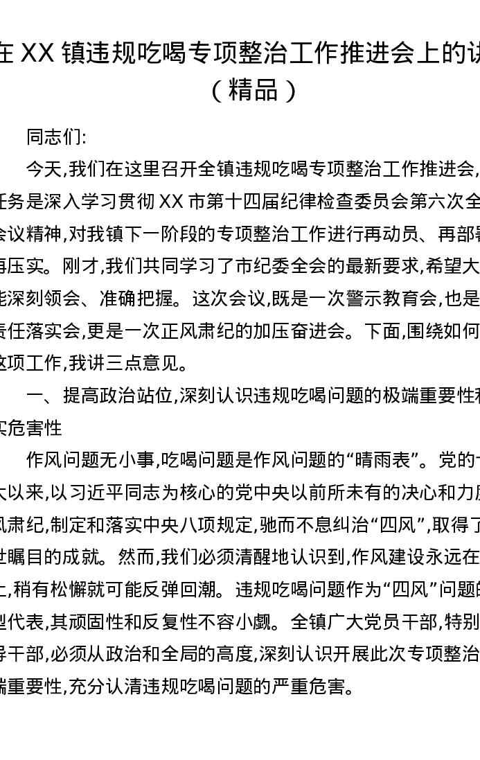 在XX镇违规吃喝专项整治工作推进会上的讲话