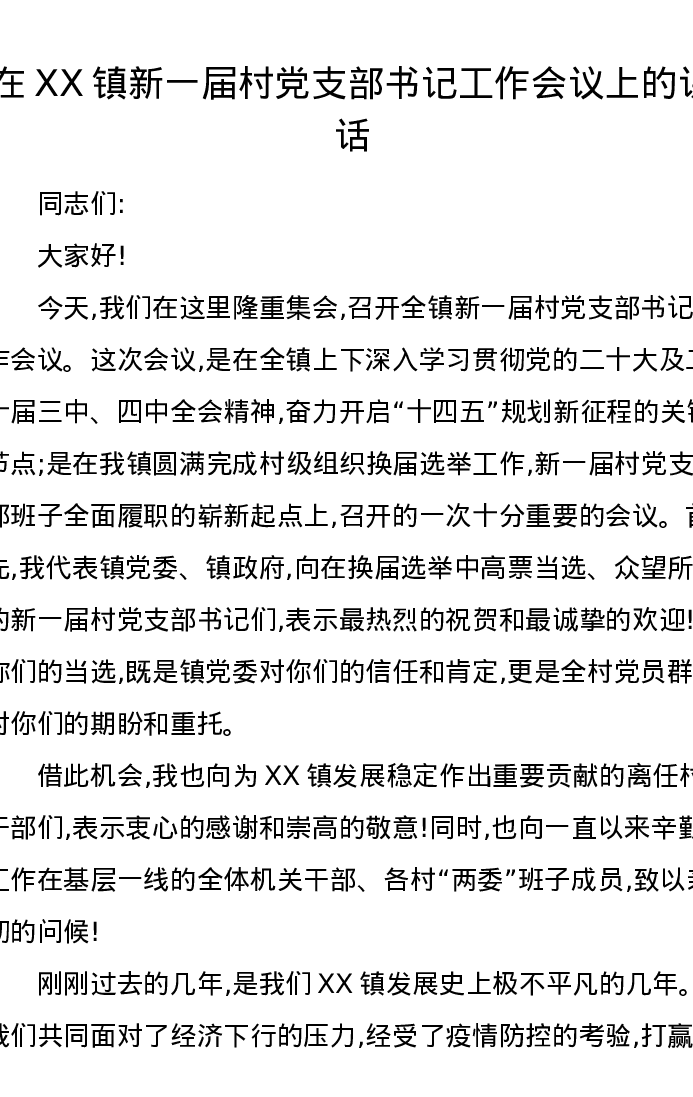 在XX镇新一届村党支部书记工作会议上的讲话