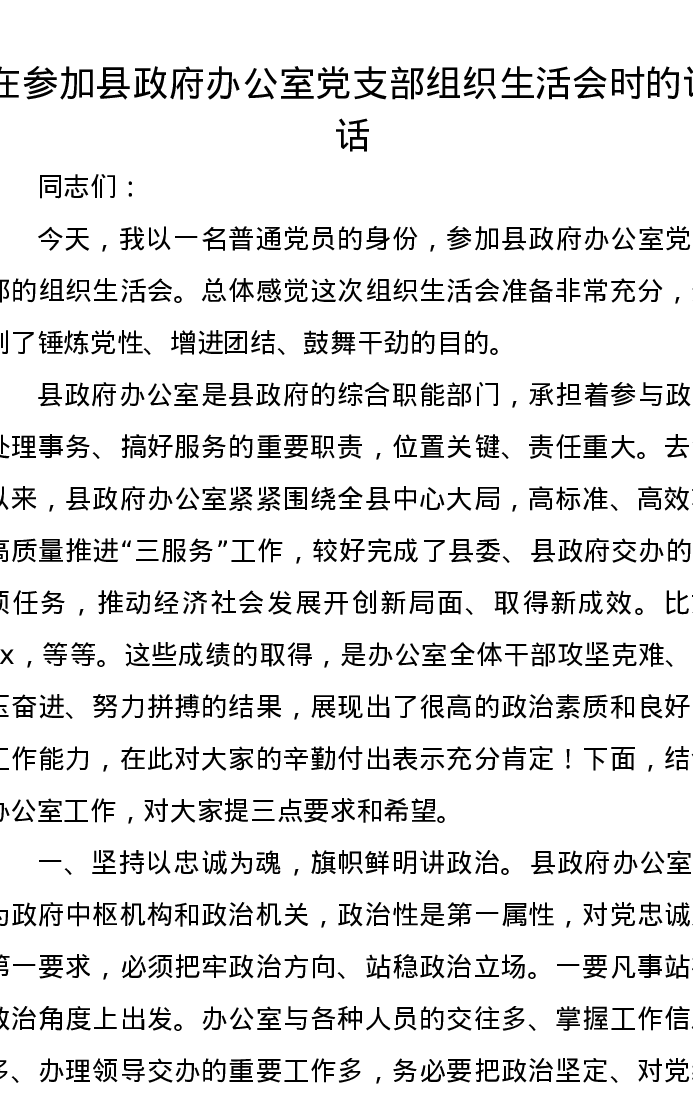 在参加县政府办公室党支部组织xxx时的讲话