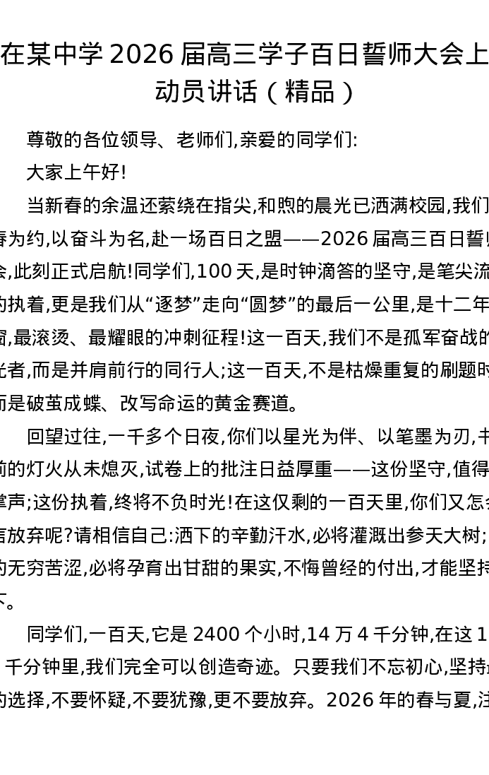 在某中学2026届高三学子百日誓师大会上的动员讲话