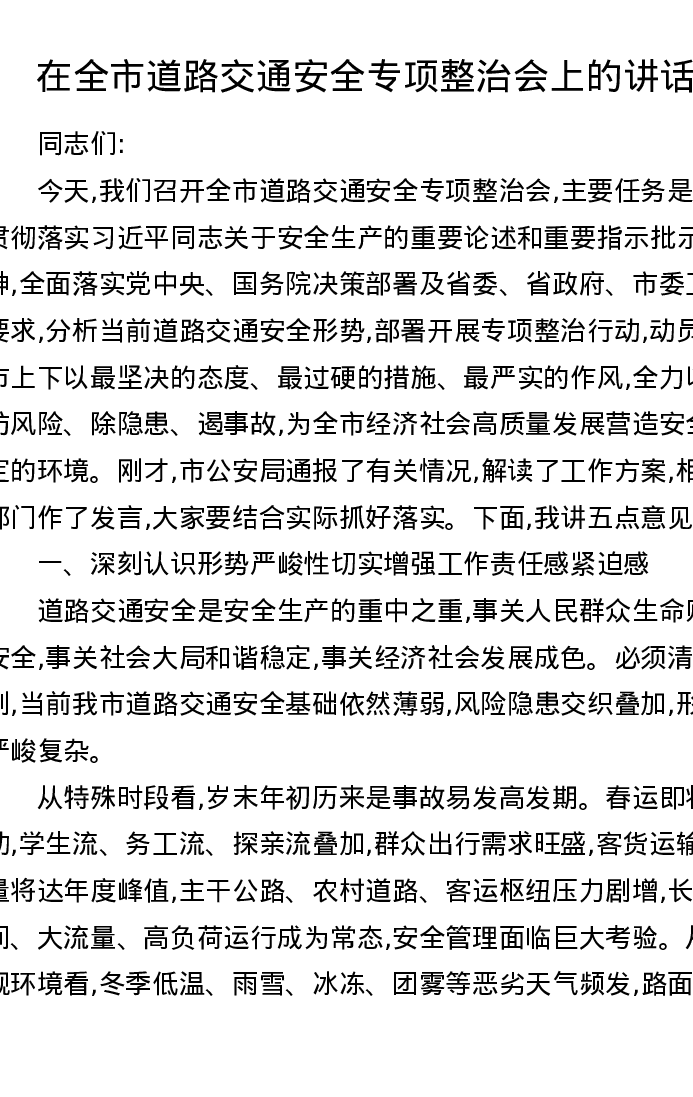 在全市道路交通安全专项整治会上的讲话