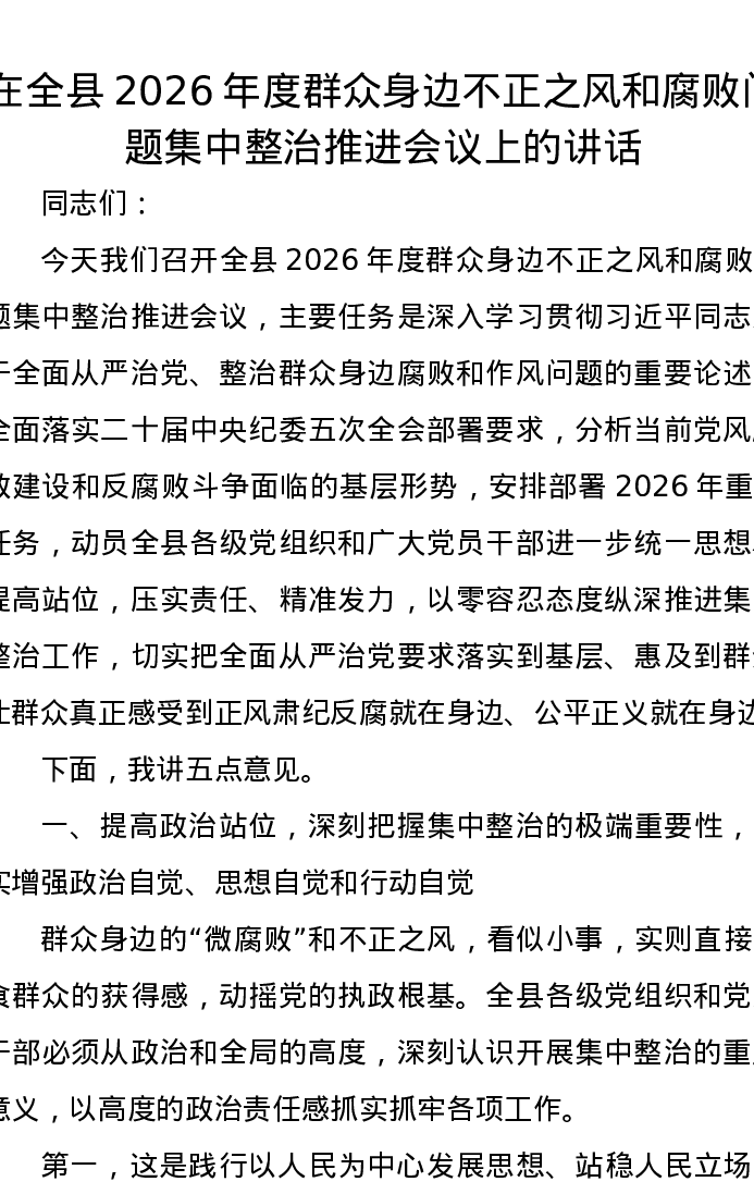 在全县2026年度群众身边不正之风和腐败问题集中整治推进会议上的讲话