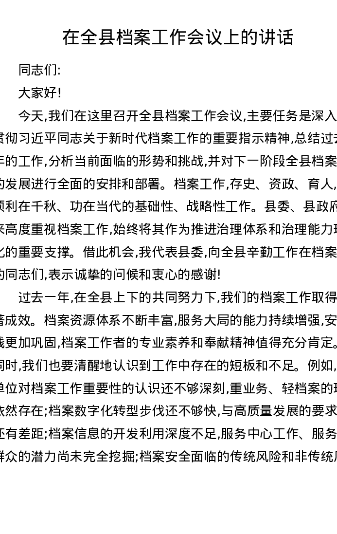 在全县档案工作会议上的讲话