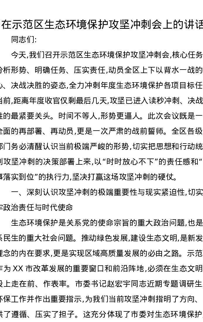 在示范区生态环境保护攻坚冲刺会上的讲话