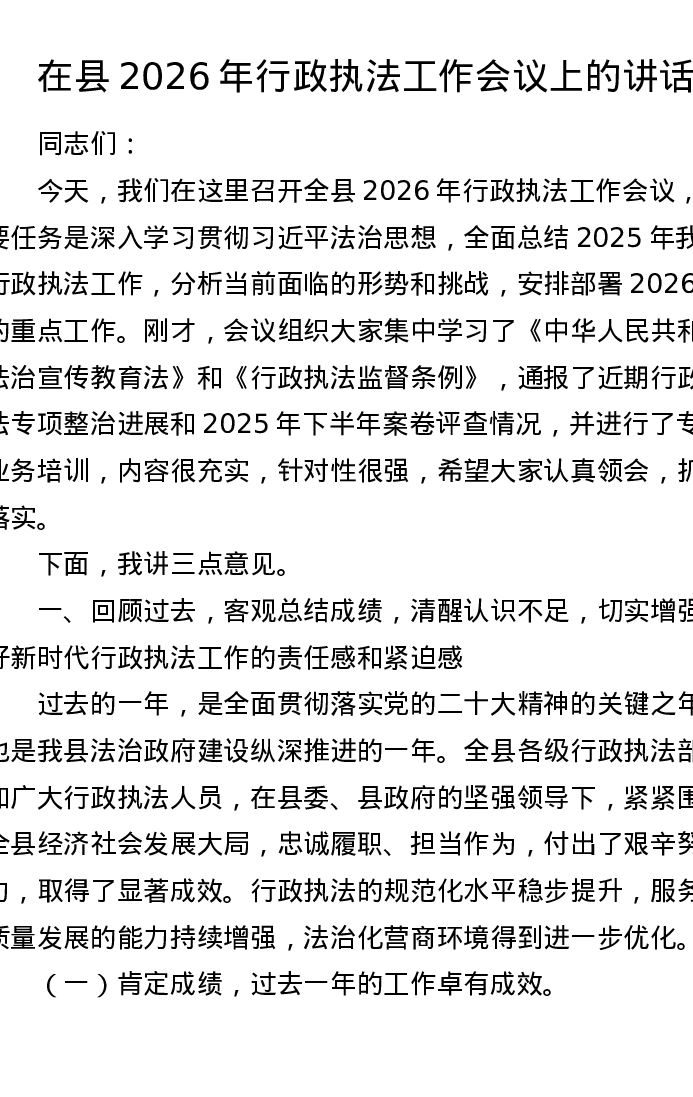 在县2026年行政执法工作会议上的讲话