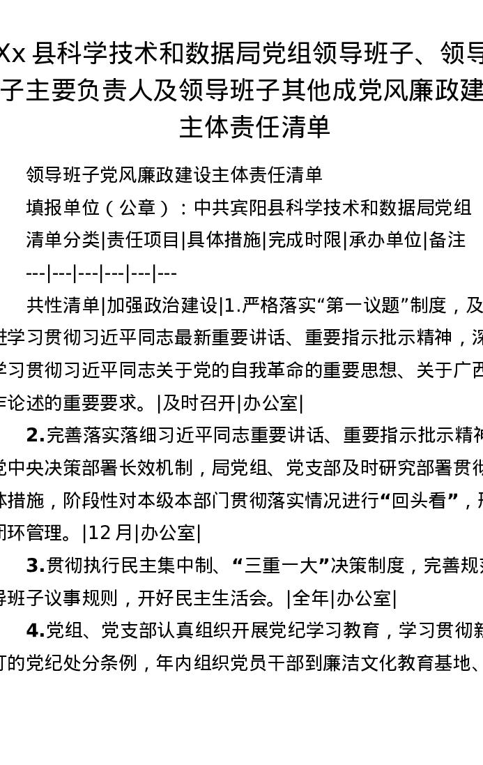 Xx县科学技术和数据局党组领导班子、领导班子主要负责人及领导班子其他成党风廉政建设主体责任清单