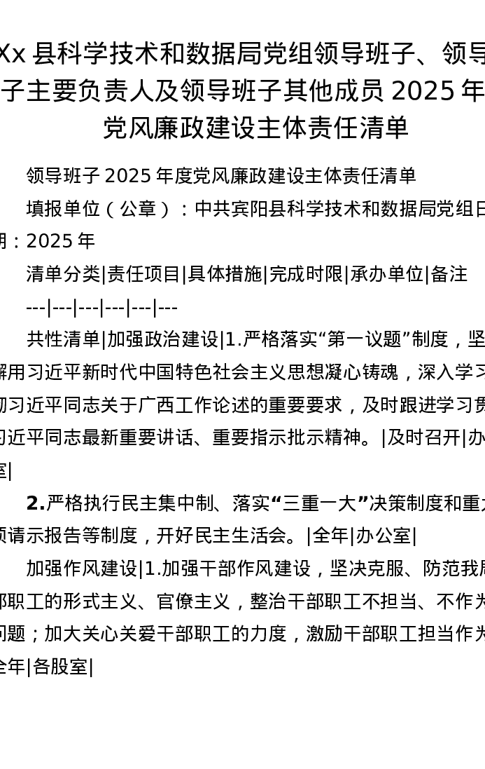 Xx县科学技术和数据局党组领导班子、领导班子主要负责人及领导班子其他成员2025年度党风廉政建设主体责任清单