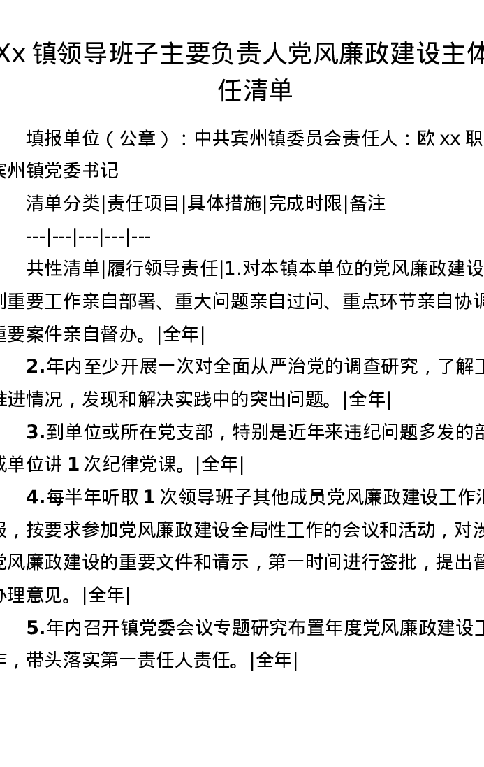 Xx镇领导班子主要负责人党风廉政建设主体责任清单