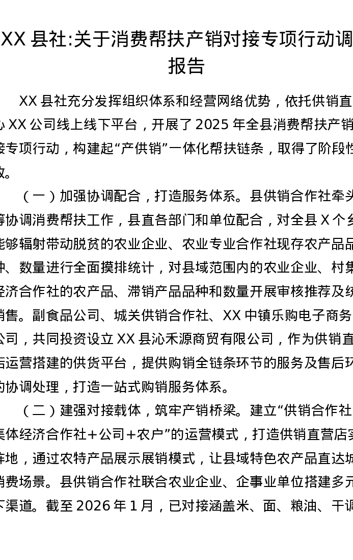 XX县社:关于消费帮扶产销对接专项行动调研报告