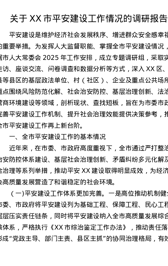 关于XX市平安建设工作情况的调研报告
