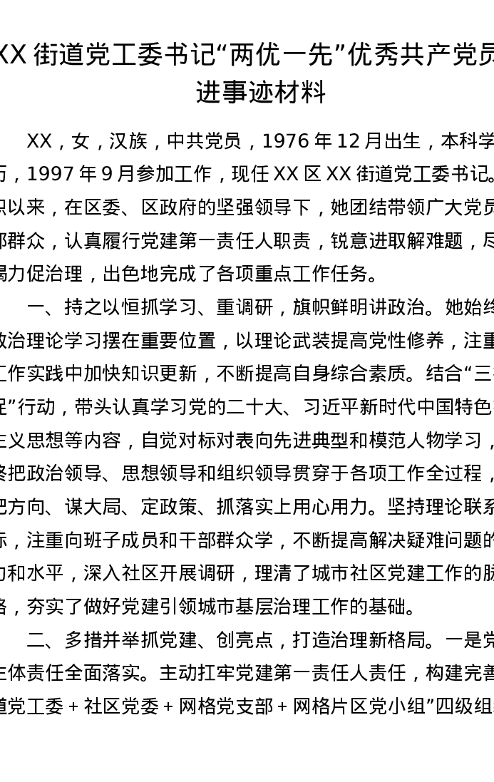XX街道党工委书记两优一先优秀共产党员先进事迹材料
