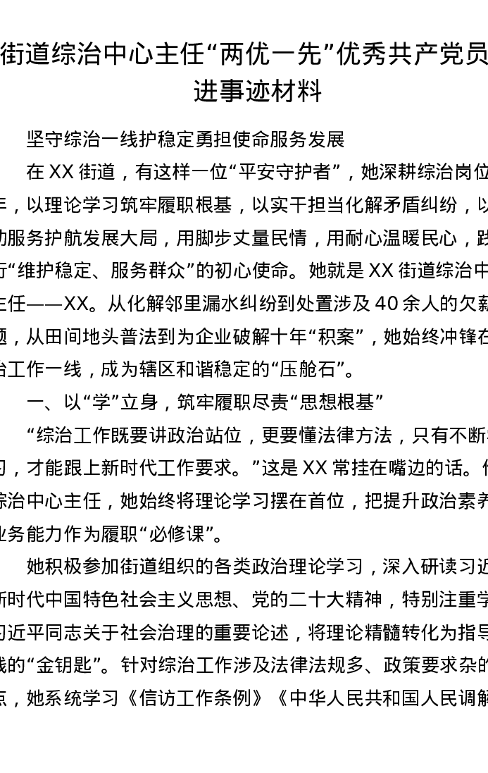 街道综治中心主任两优一先优秀共产党员先进事迹材料