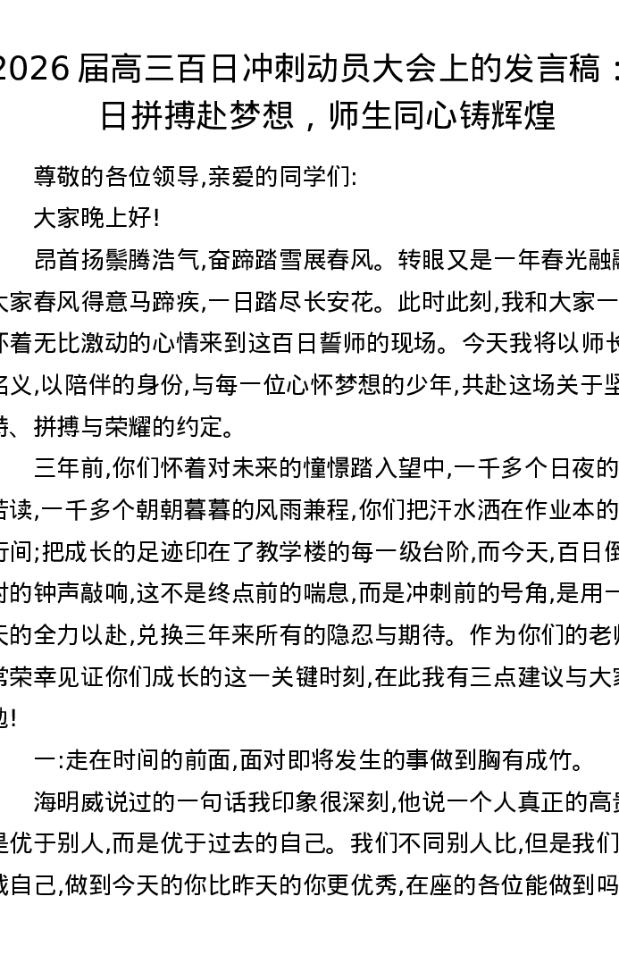 2026届高三百日冲刺动员大会上的发言稿:百日拼搏赴梦想,师生同心铸辉煌