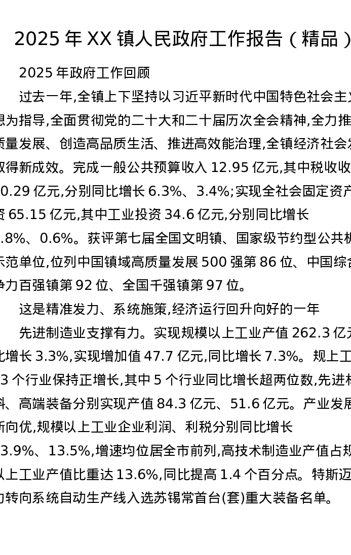 2025年XX镇人民政府工作报告