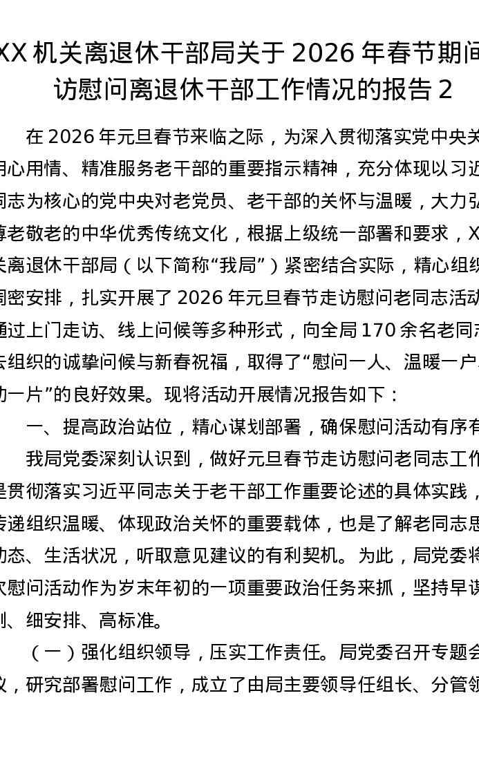 XX机关离退休干部局关于2026年春节期间走访慰问离退休干部工作情况的报告2