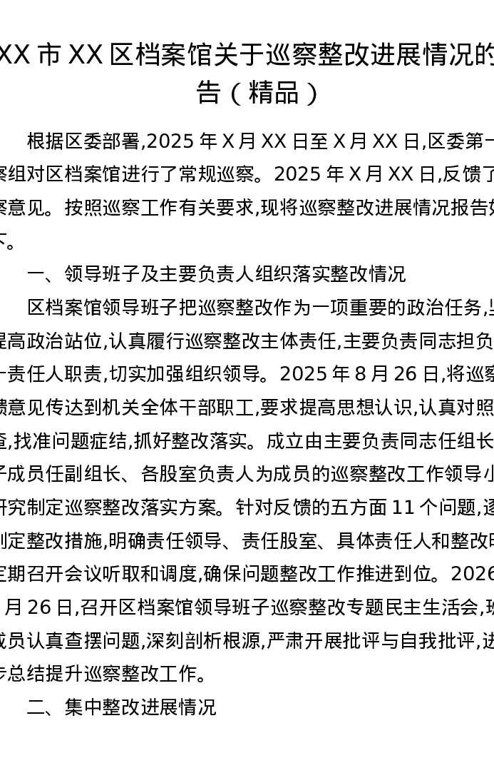 XX市XX区档案馆关于巡察整改进展情况的报告