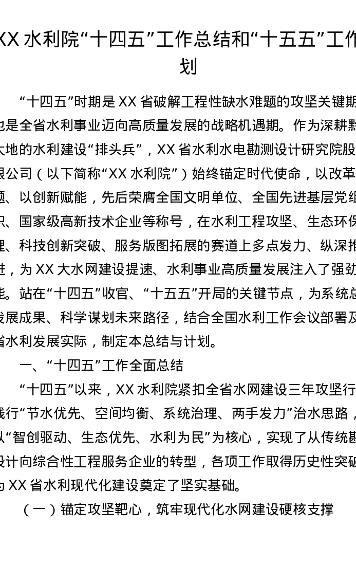 XX水利院十四五工作总结和十五五工作计划