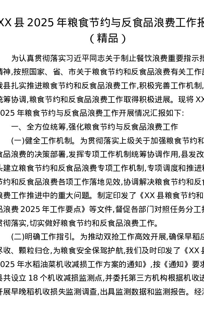 XX县2025年粮食节约与反食品浪费工作报告