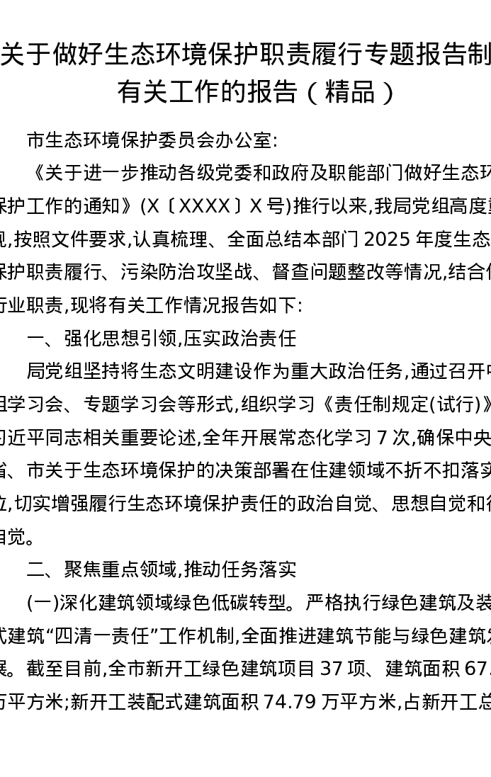 关于做好生态环境保护职责履行专题报告制度有关工作的报告